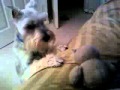 Miniature Schnauzer playing with his new Martha Stewart electronic stuffed owl...Max's new Owl | |